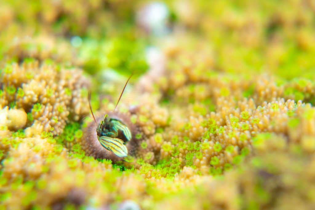 緑のポリプのコモンサンゴにカンザシヤドカリ