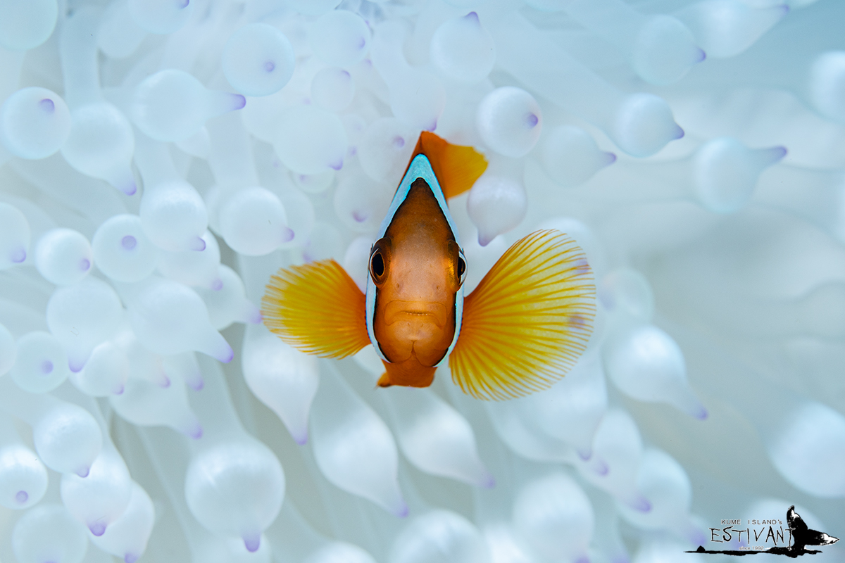 「白化したままのタマイタダキイソギンチャクとハマクマノミ」