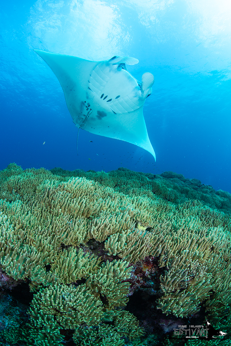 「根の上いっぱいのソフトコーラル(トサカウネタケかな?)とマンタ」