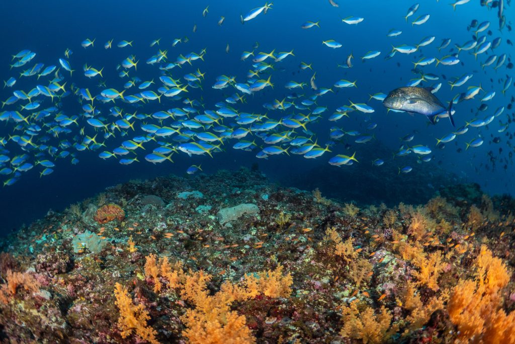 深くて流れていて・・・という環境が他とは違うのか、オレンジのソフトコーラルもたくさん生えています。